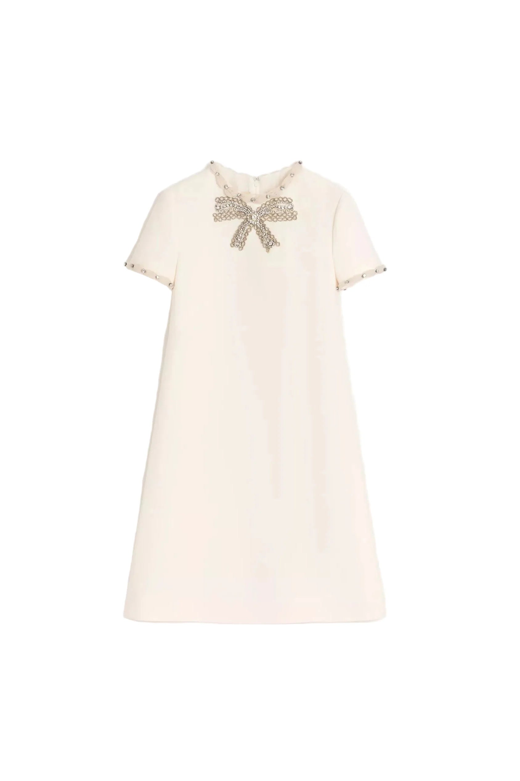 Elevate your evening repertoire with this sophisticated crepe mini dress, meticulously crafted in pristine ivory. Delicate rhinestone embroidery adorns the silhouette, creating an understated yet captivating shimmer that catches light beautifully. The fluid crepe fabric drapes elegantly while maintaining structure, offering both comfort and refined polish. Perfect for cocktail events, upscale dinners, or special occasions where refined glamour is essential. The timeless ivory hue pairs effortlessly with statement jewelry and heels, making it a versatile investment piece for the discerning wardrobe.