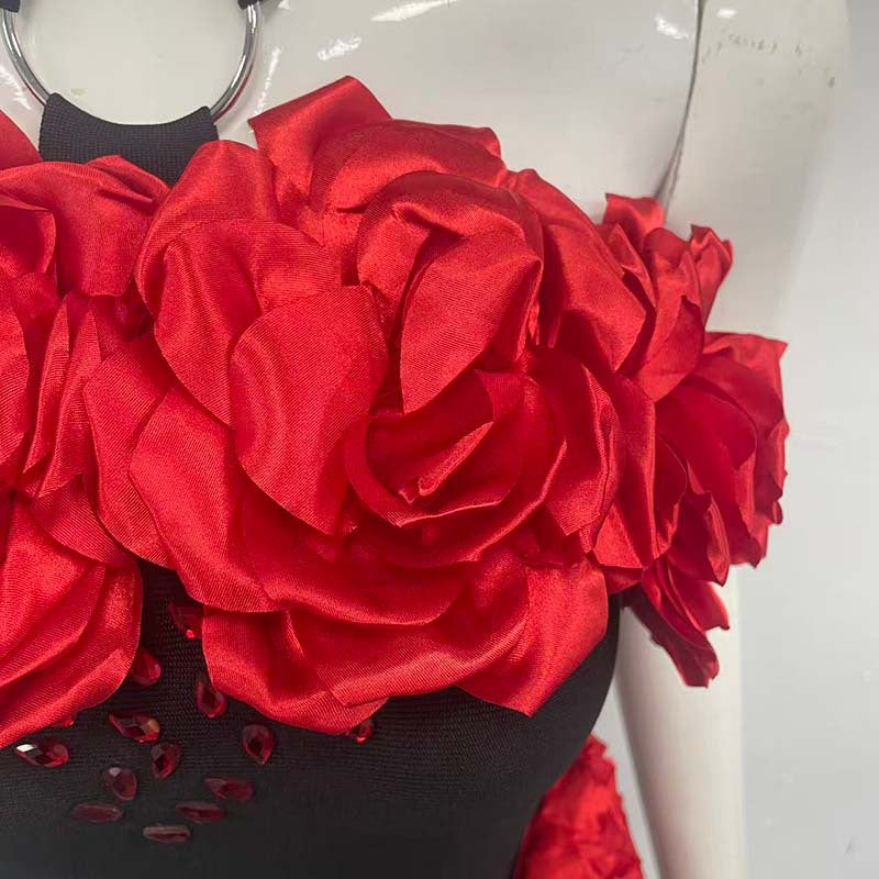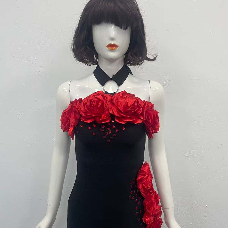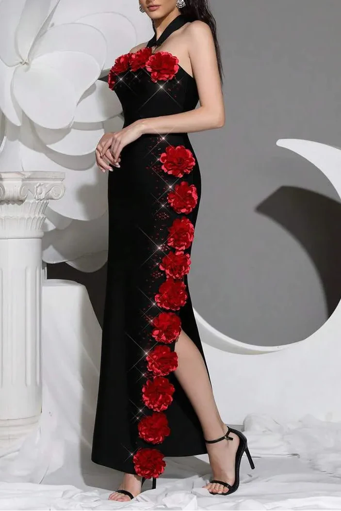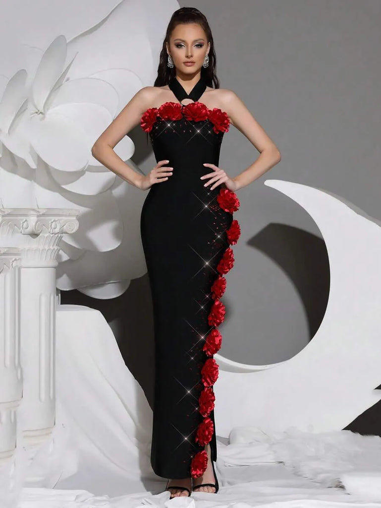 The sebastiane Halterneck Flower Bandage Maxi Dress in black combines architectural tailoring with refined elegance. This floor-length silhouette features a striking halterneck neckline that frames the shoulders while the signature bandage construction provides a sculpted, body-contouring fit. Delicate floral detailing adds visual interest to the classic black palette, creating a sophisticated piece suitable for evening events or upscale occasions. The maxi length and structured design deliver timeless appeal with contemporary flair.