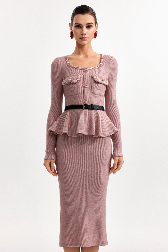 Skylar U Neck Long Sleeve Falbala Knit Midi Dress in pink
