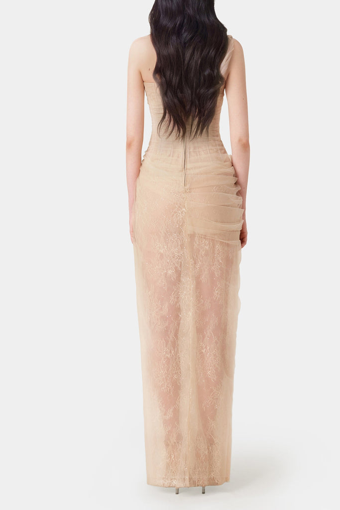 The Mara Beige Lace Corset Dress is a stunning and sophisticated choice, perfect for special occasions.