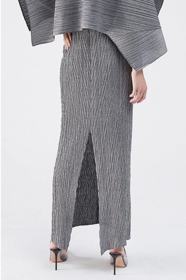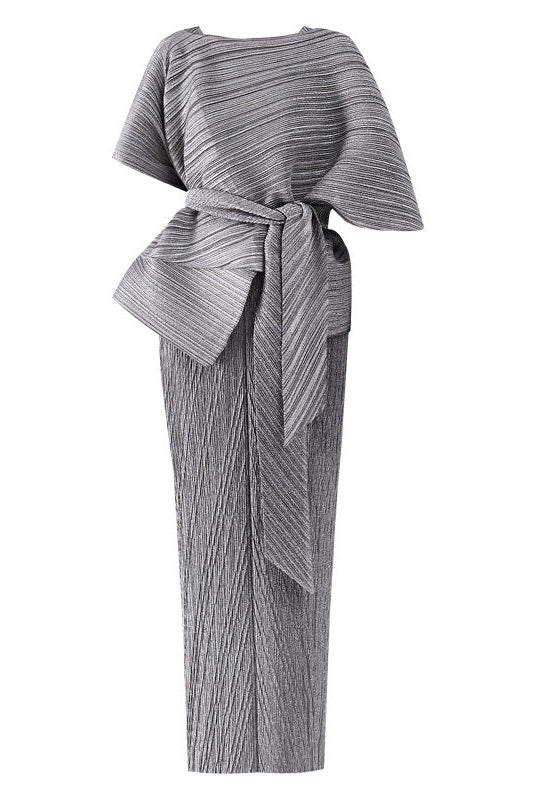 The Maureen Pleated Midi Dress with Cape in Gray Set combines sophisticated tailoring with versatile layering. This ensemble features a gracefully pleated midi dress paired with a coordinating cape, creating an elevated silhouette perfect for formal occasions or refined everyday wear. The neutral gray palette ensures effortless coordination with your existing wardrobe, while the pleated construction adds dimension and movement. The detachable cape offers styling flexibility—wear it together for dramatic impact or separately for two distinct looks. Crafted for those who appreciate polished, timeless design with modern versatility.