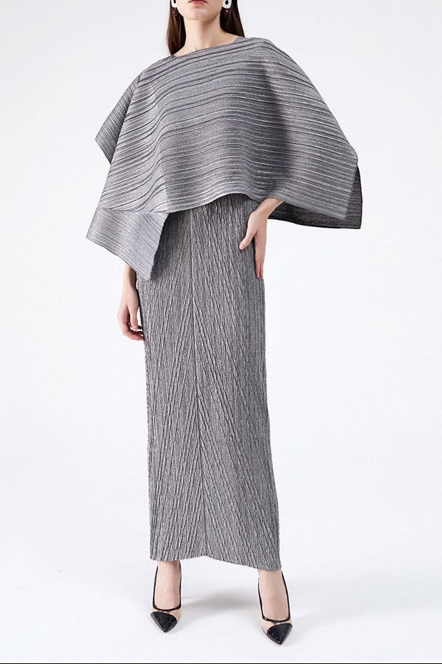 zona pleated midi dress with cape in gray set