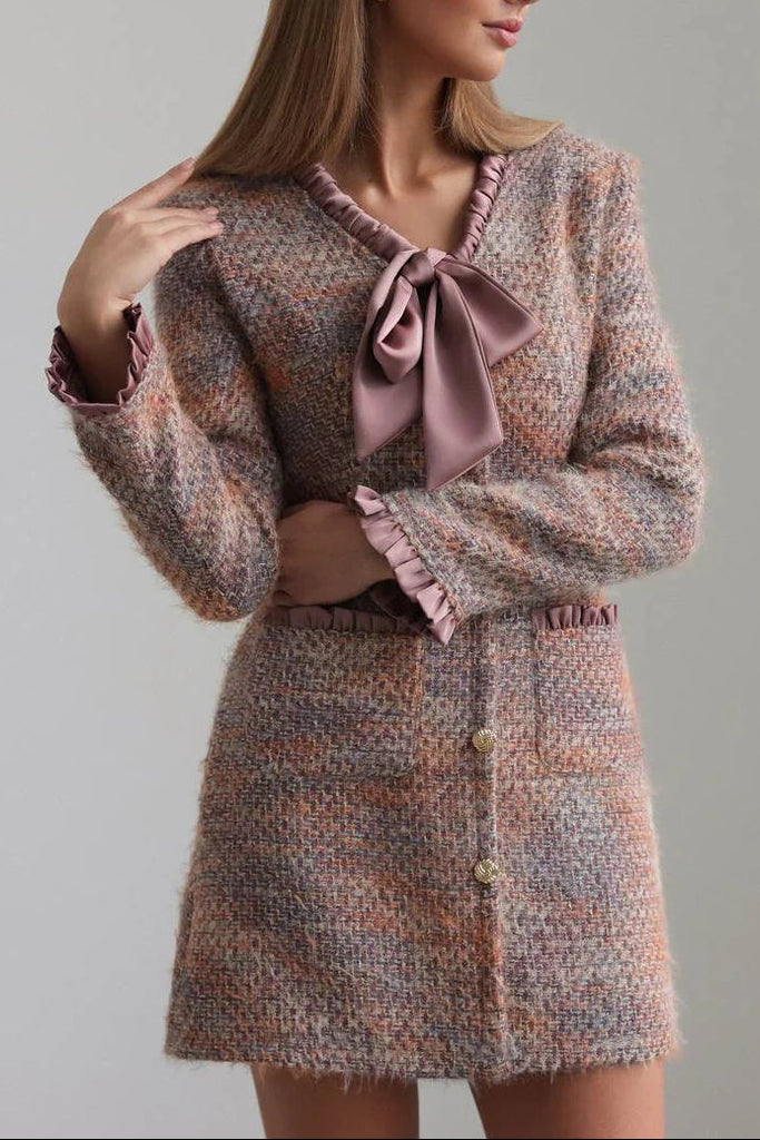xylia bow v-neck long sleeve mini dress in multicolor