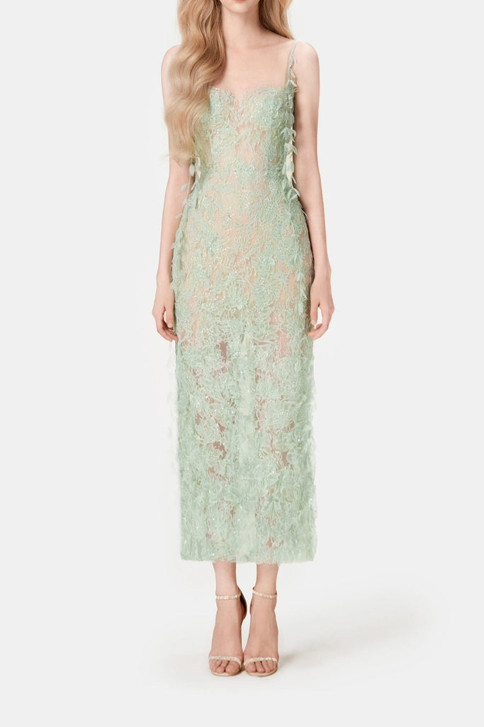 sabina Spaghetti Rhinestone Split Midi Dress In Gold