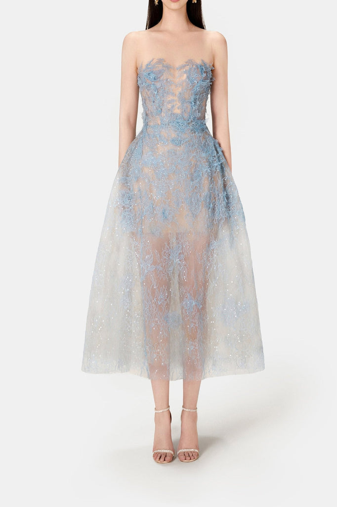 tiffany FLORAL RAMAGE lace EMBROIDERY MIDI DRESS IN BLUE