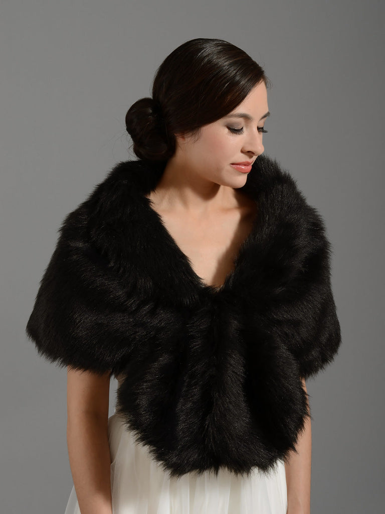 Faux fur wrap bridal shrug in black color, fully lined with soft and warm fleece lining. There are 2 pairs of hook and eye closures in the front to fasten the wrap. It's perfect for wedding or other special occasions. There are two sizes available: S/M size: 103cm between the first pair of hook and eye closures, total length is 150cm, fits US size 0 ~ 10; L/XL size: 113cm between the first pair of hook and eye closures, total length is 160cm, fits US size 12 ~ 18.