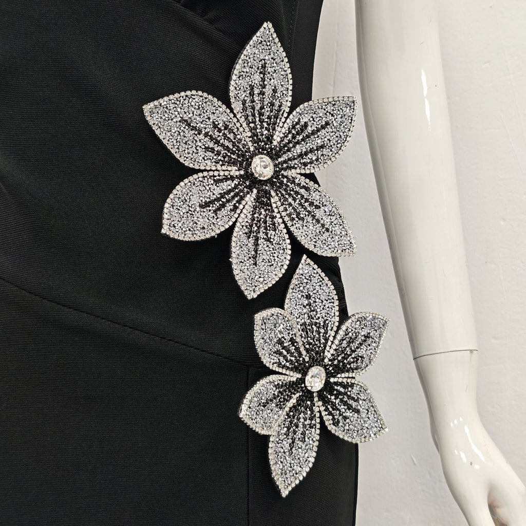 Erlinda black 3D Floral Rhinestone Bodycon Slit Maxi Bandage Dress