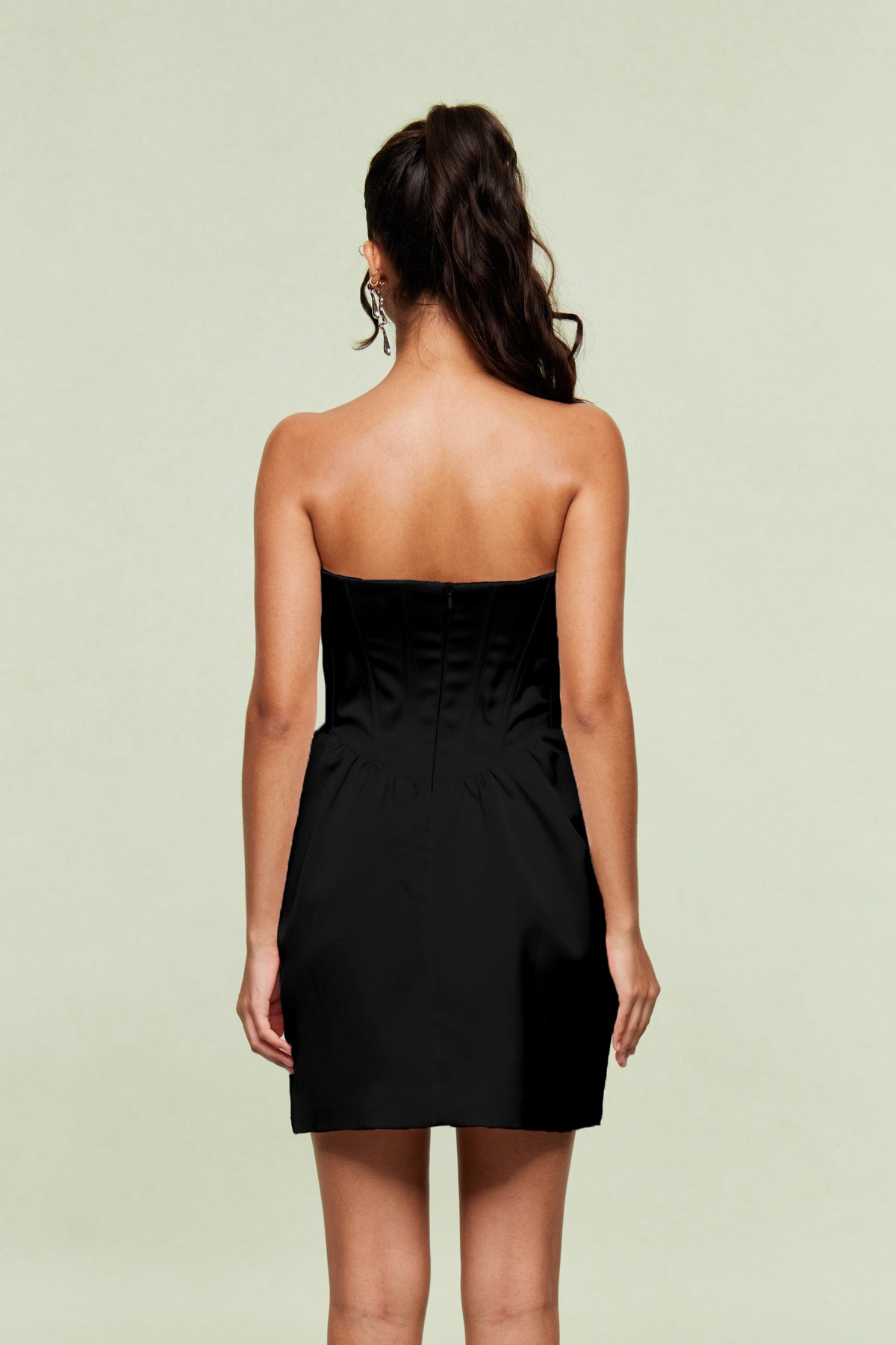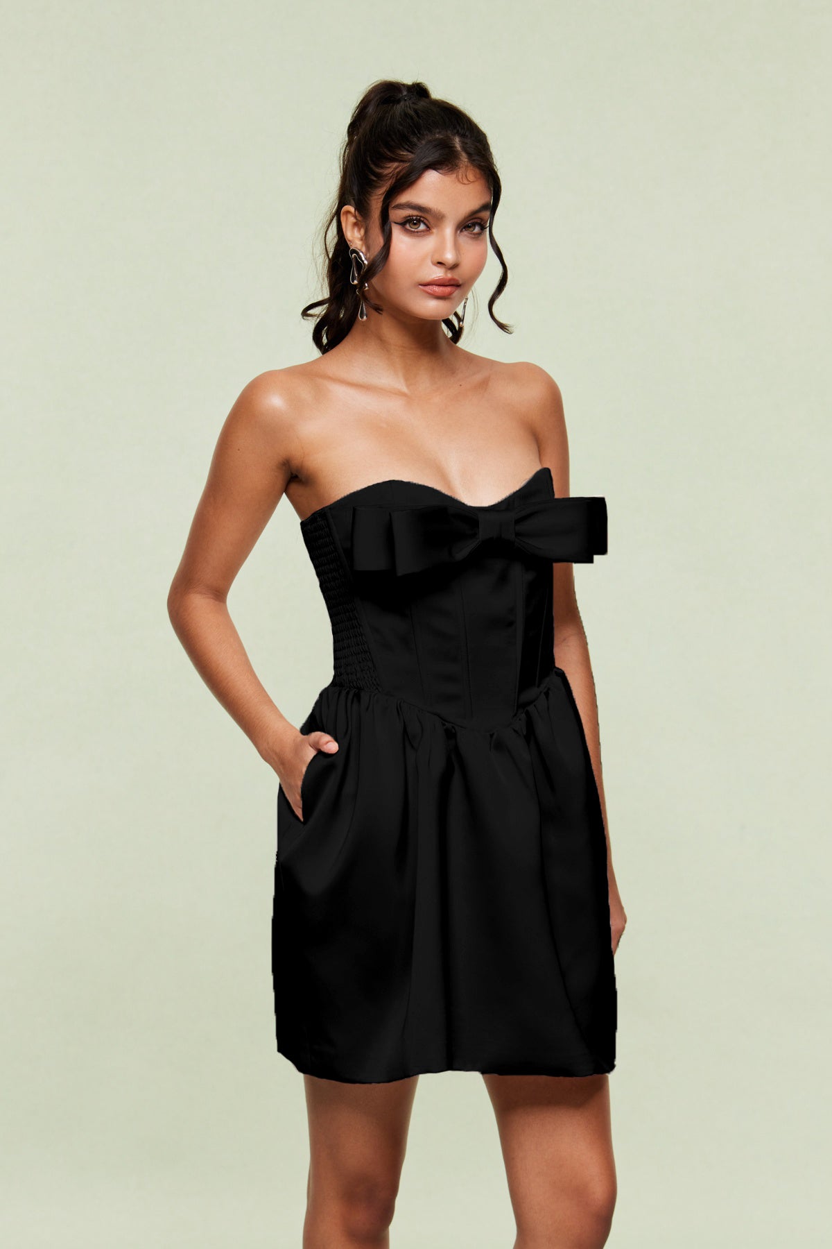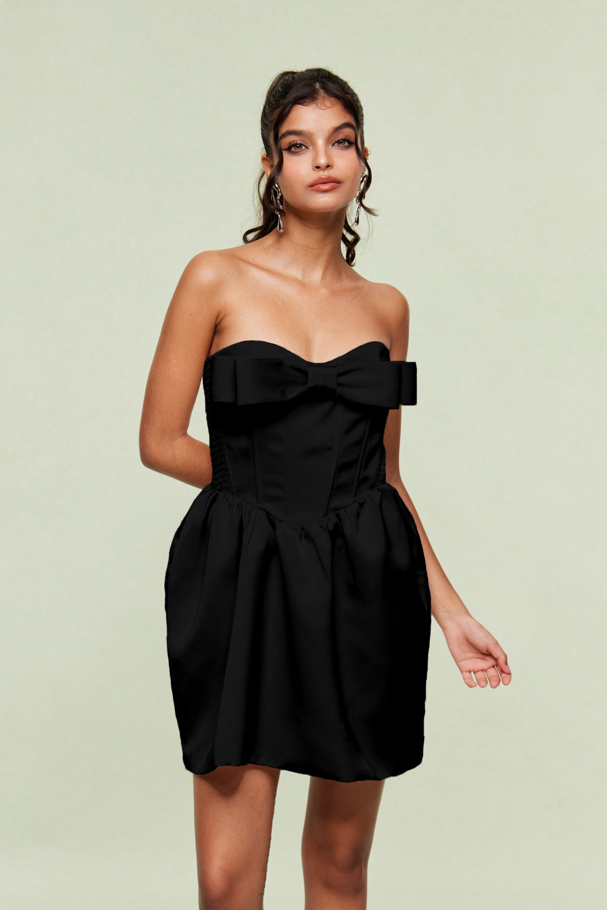 The Blair Strapless Bow Corset Mini Dress in Black combines timeless elegance with modern sophistication. Designed with a structured corset silhouette, it offers a flattering fit that enhances your natural shape. The strapless neckline highlights the shoulders, while the oversized bow detail adds a chic, feminine touch. Crafted for both style and comfort, this mini dress is perfect for upscale events or evening occasions where you want to make a confident statement.