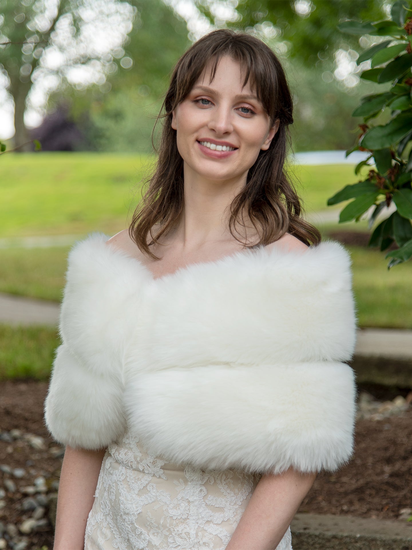 Faux fur bridal wrap shrug in ivory color, fully lined with fleece lining. It's perfect for your wedding or other special occasions.