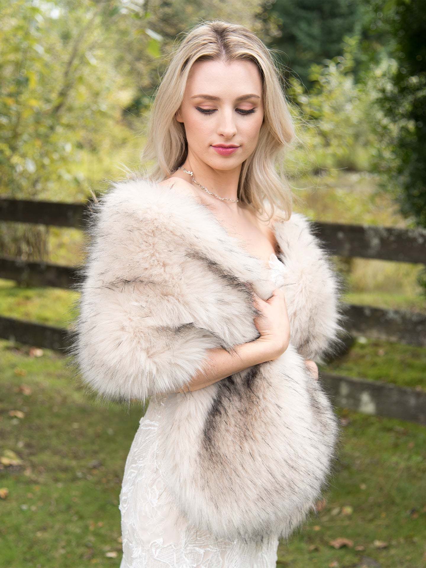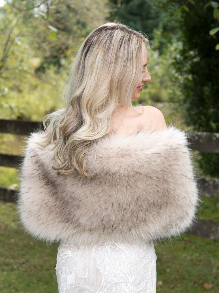 Beautiful faux fur wrap made of luxurious and soft faux fur with darker tips. The color is light blush which will match wedding dresses with champagne or skin colored underlining perfectly. It is the high imitation of the real racoon fur. Fully lined with soft and warm fleece lining. It's perfect for wedding or other special occasions.