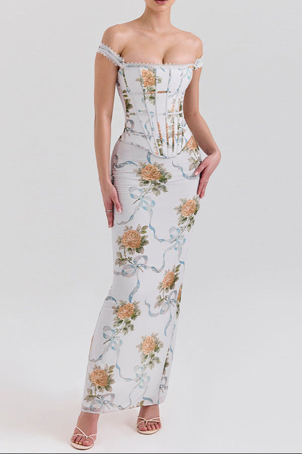 roberta off-shoulder flower embellished pleated maxi dress in white