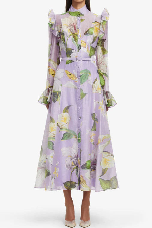 nancy purple Lily Blossom Print Butterfly Sleeve Maxi Dress