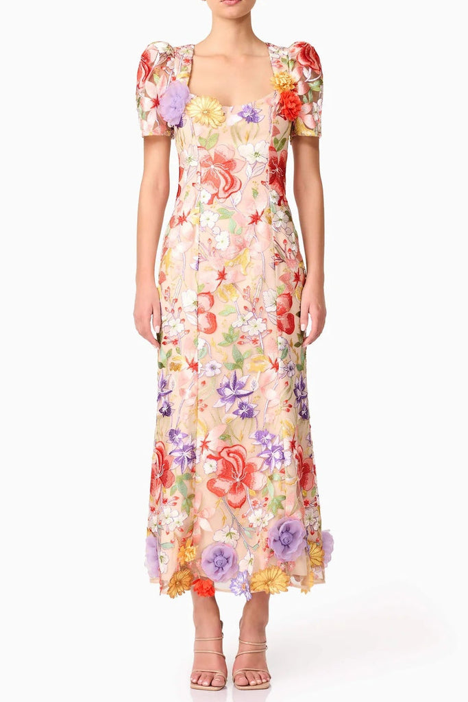 Tomas multicolor Square Neck backless Mesh Embroidered Fishtail maxi Dress