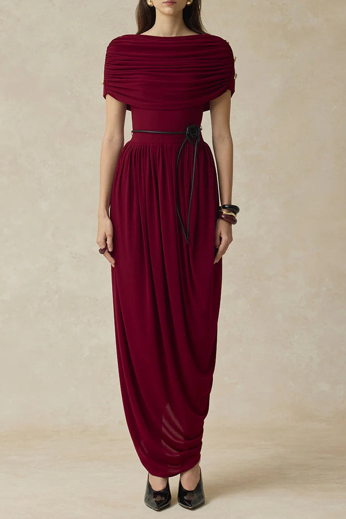 irma red pleated Form-fitting maxi dress with asymmetrical draped shoulder