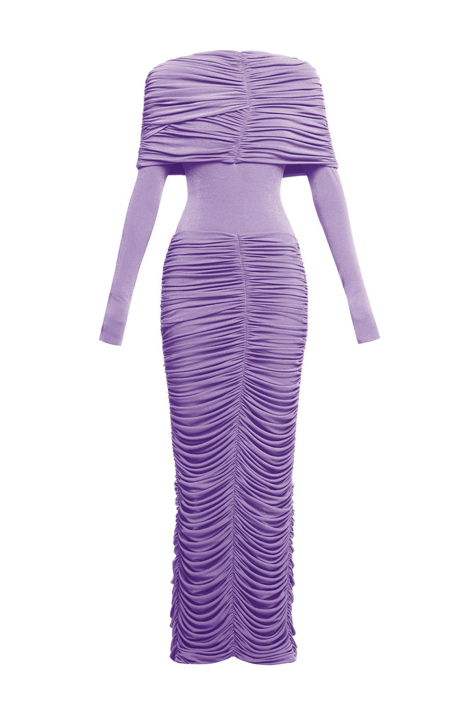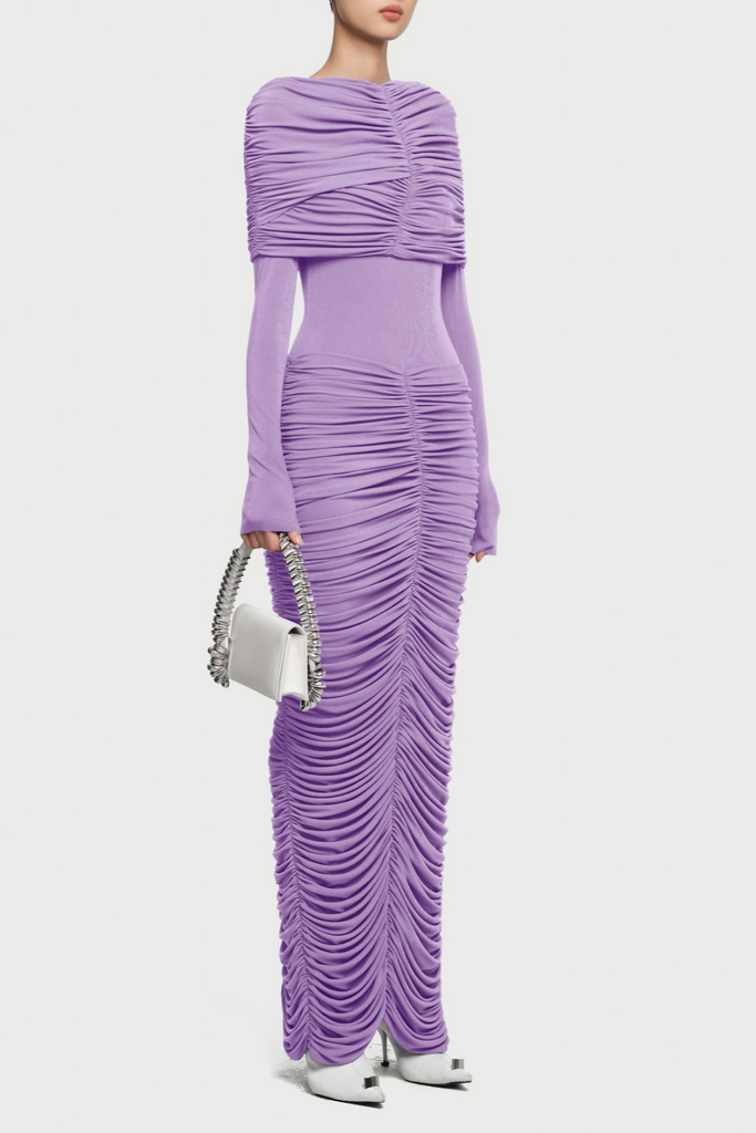 Elevate your evening wardrobe with this sophisticated purple maxi dress, engineered for a refined silhouette. The form-fitting bodice showcases precise pleating that creates dimension and movement, while the asymmetrical draped shoulder adds an unexpected architectural element. The floor-length cut delivers timeless elegance, making this piece ideal for formal occasions, upscale events, or anyone seeking a statement-making ensemble. The thoughtful design balances structure with fluidity, ensuring both comfort and commanding presence.