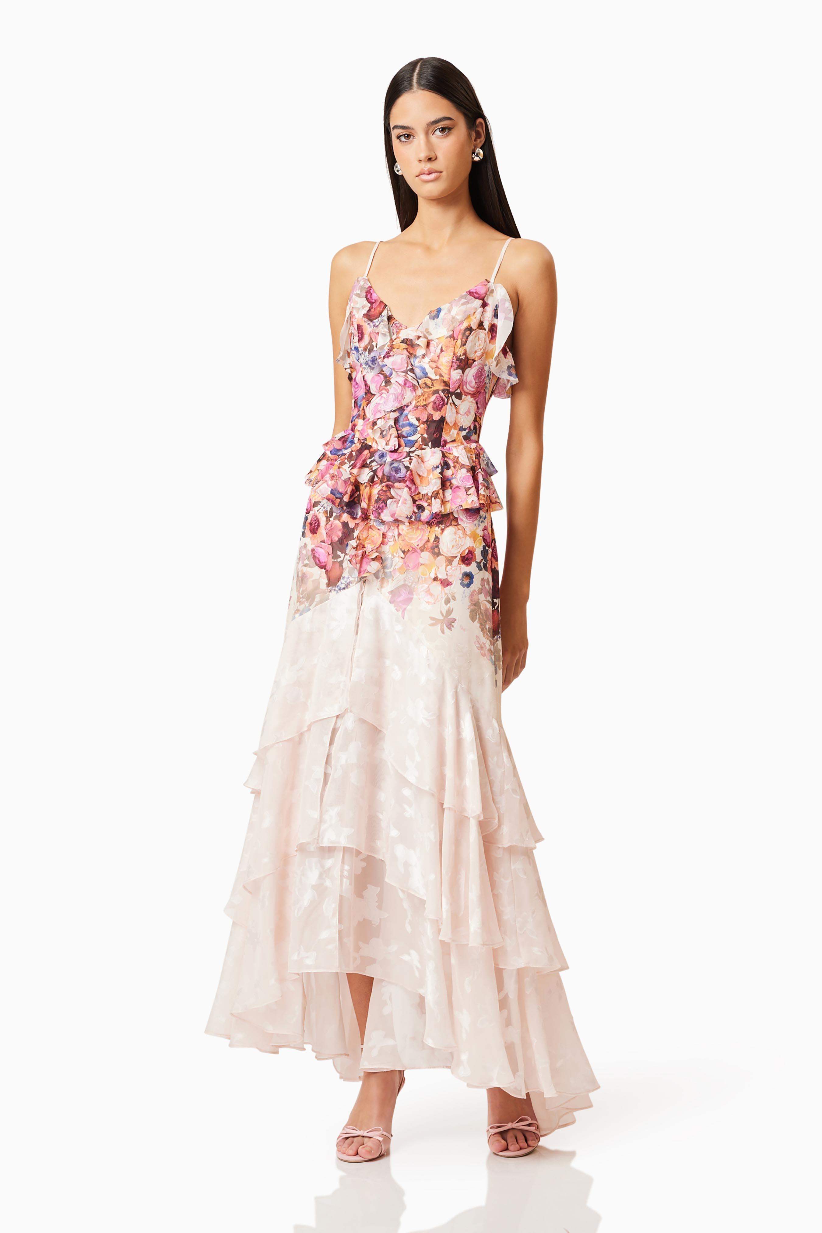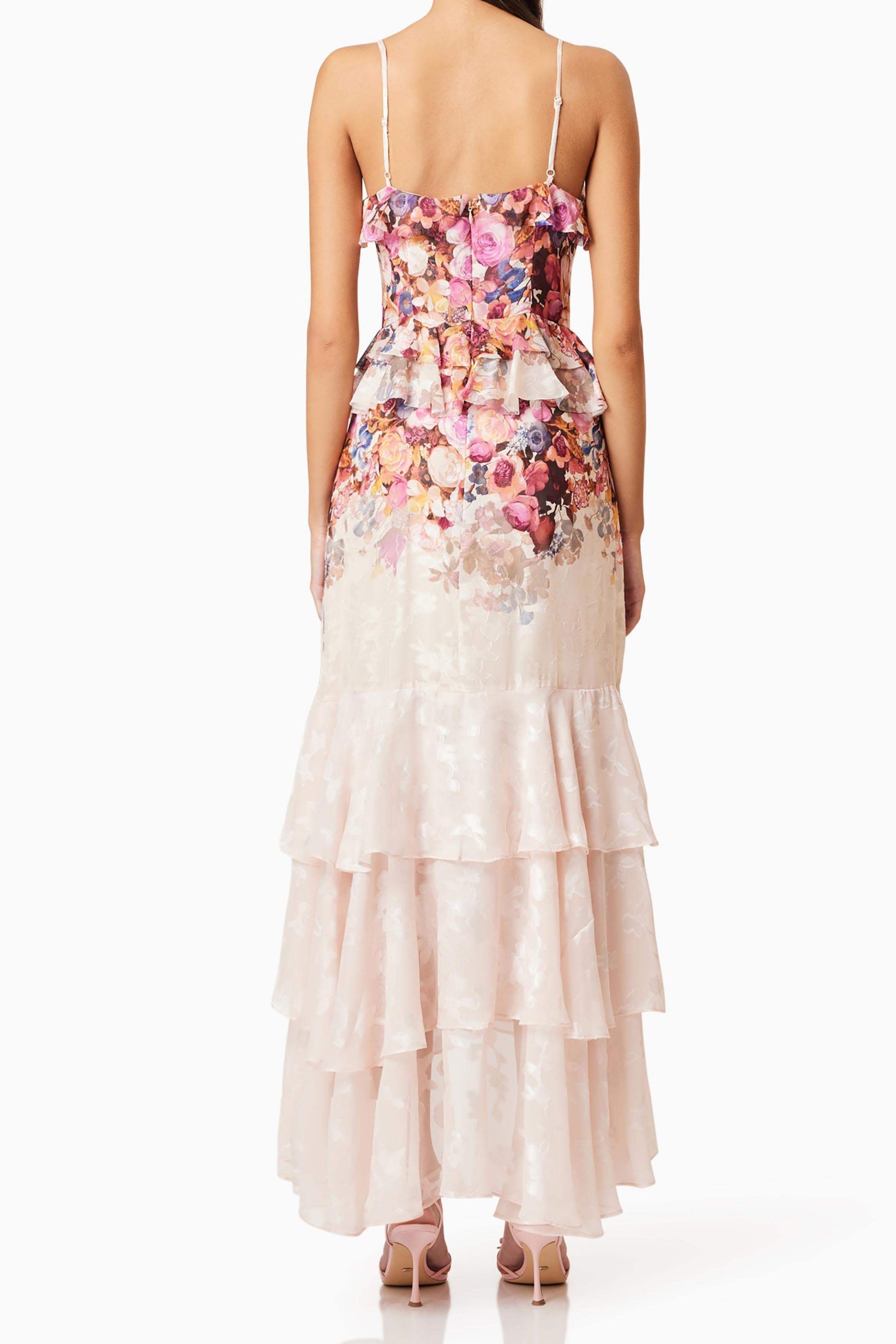 Crafted from sheer floral georgette, the dress offers a dreamy, lightweight feel that gently flows with each step. The frill-tiered waistline and skirt create a playful, yet sophisticated silhouette that flatters the figure, making it perfect for a variety of occasions. Whether you're attending a garden party, wedding, or formal evening event, this dress ensures you stand out with effortless charm.