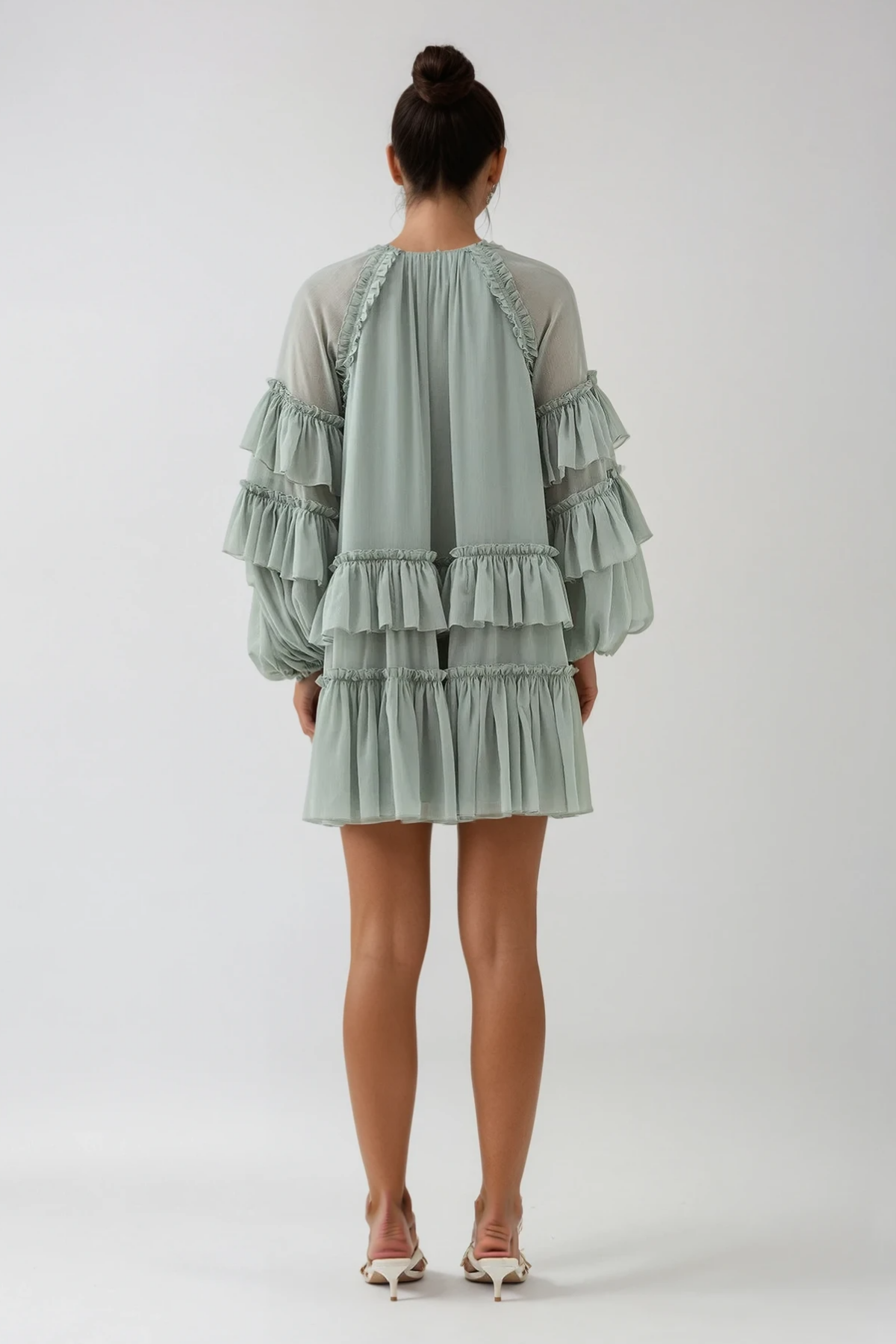 Enhance your wardrobe with the Berta Balloon Sleeve Mesh Ruch Ruffle Mini Dress. Featuring balloon sleeves and ruched detailing, this dress offers a unique and fashionable look. The mesh fabric adds a touch of elegance, perfect for any occasion. Elevate your style with this must-have dress.