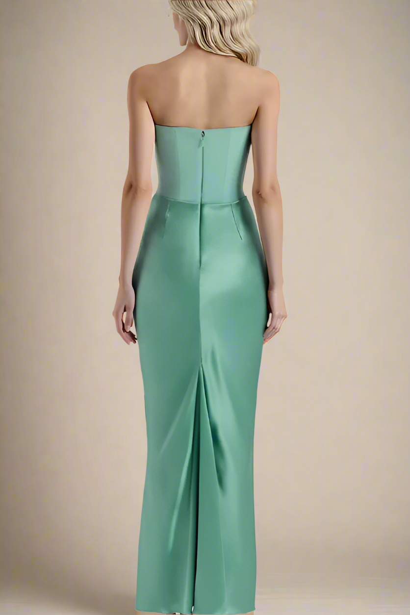 FEATURES & CARE -Premium Polyester and Satin -Maxi Length, full length approx 136cm -Green Wrap Dress -Corset Style Dress -Strapless Sleeves -Ruched Wrapped Detailing -Pencil Skirt -Gentle Machine Wash