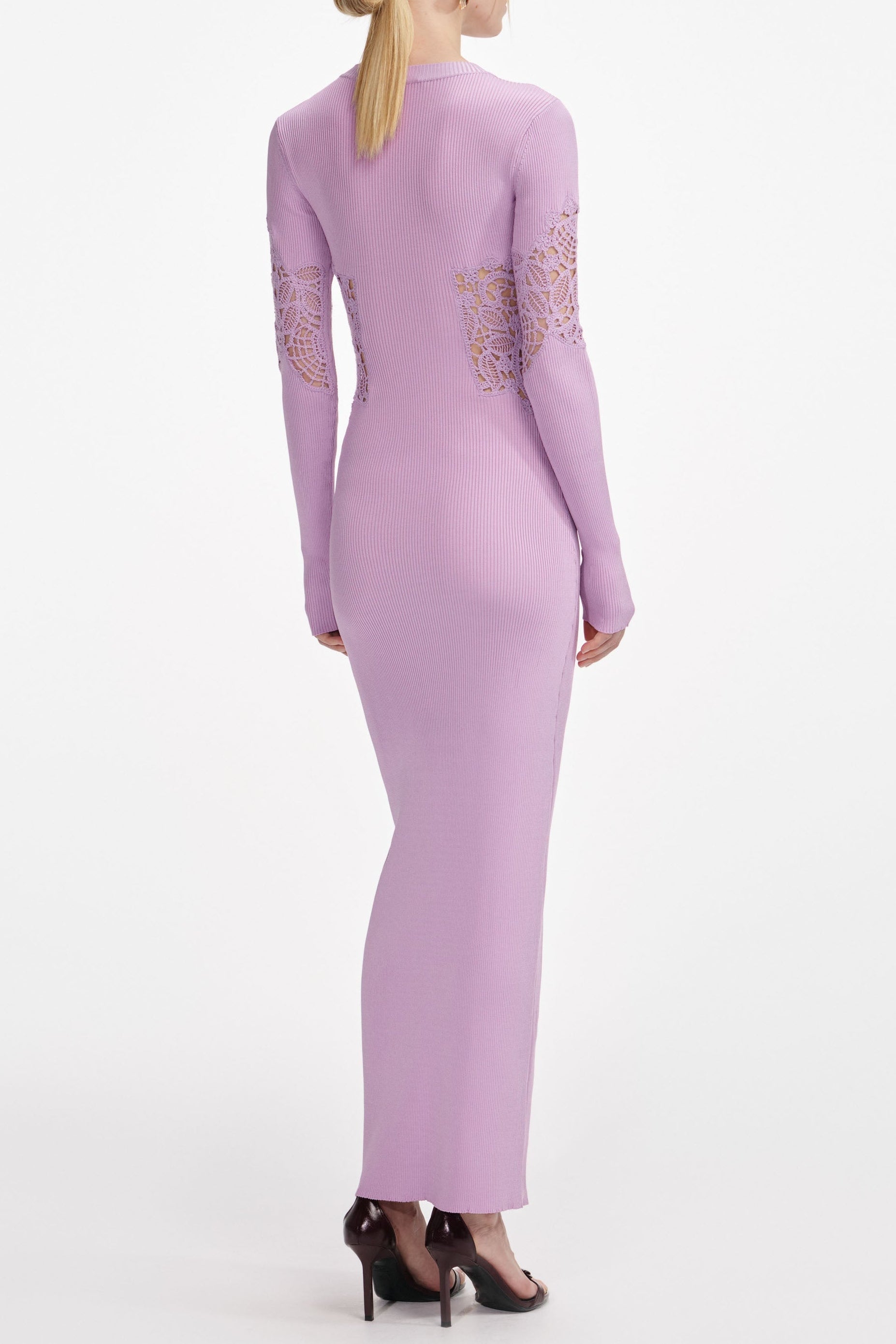 Peekaboo lace detailing at the front and sleeves give this pink viscose knit dress a certain see-and-be-seen allure. Fitted to the form, add heels and statement earrings for a knockout party look.