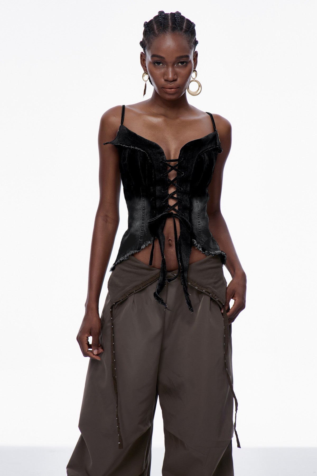 The Carl Lace Up Fringe Denim Top combines classic denim durability with contemporary style. Featuring a lace-up front for adjustable fit and fringe detailing that adds dynamic texture, this top offers both comfort and a distinctive look. Ideal for layering or wearing solo, it elevates casual outfits with expert craftsmanship and attention to detail.