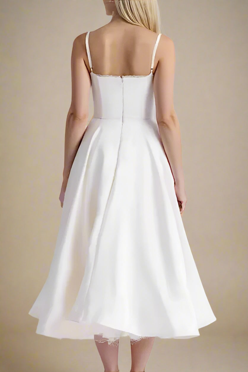 The Mavis Bodycon Midi Dress in Crem is the perfect tulle dress for your next fairy tale event. Crafted from a lightweight polyester with a satin finish, this dress features thin spaghetti straps, a sweetheart neckline adorned with lace, a back zipper, and a voluminous A-line skirt with tulle underneath to create that full-bodied princess silhouette. It's perfect for all shapes and sizes and the perfect addition to any wardrobe.