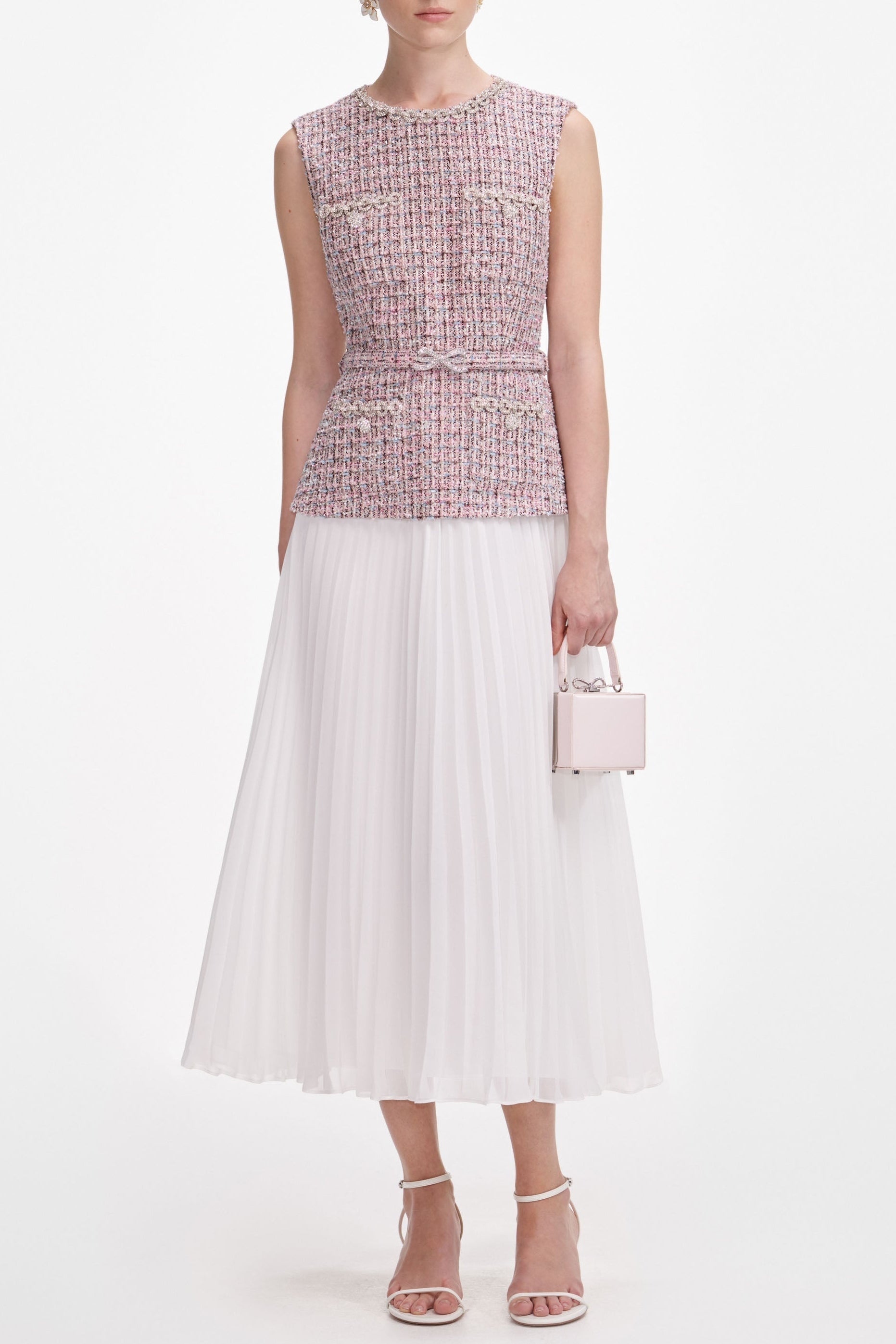 Structured pink bouclé and an airy chiffon skirt unite to elegant effect in this midi dress. Belted to flatter the waist, diamanté trims add decadent sparkle to the precisely tailored bodice.