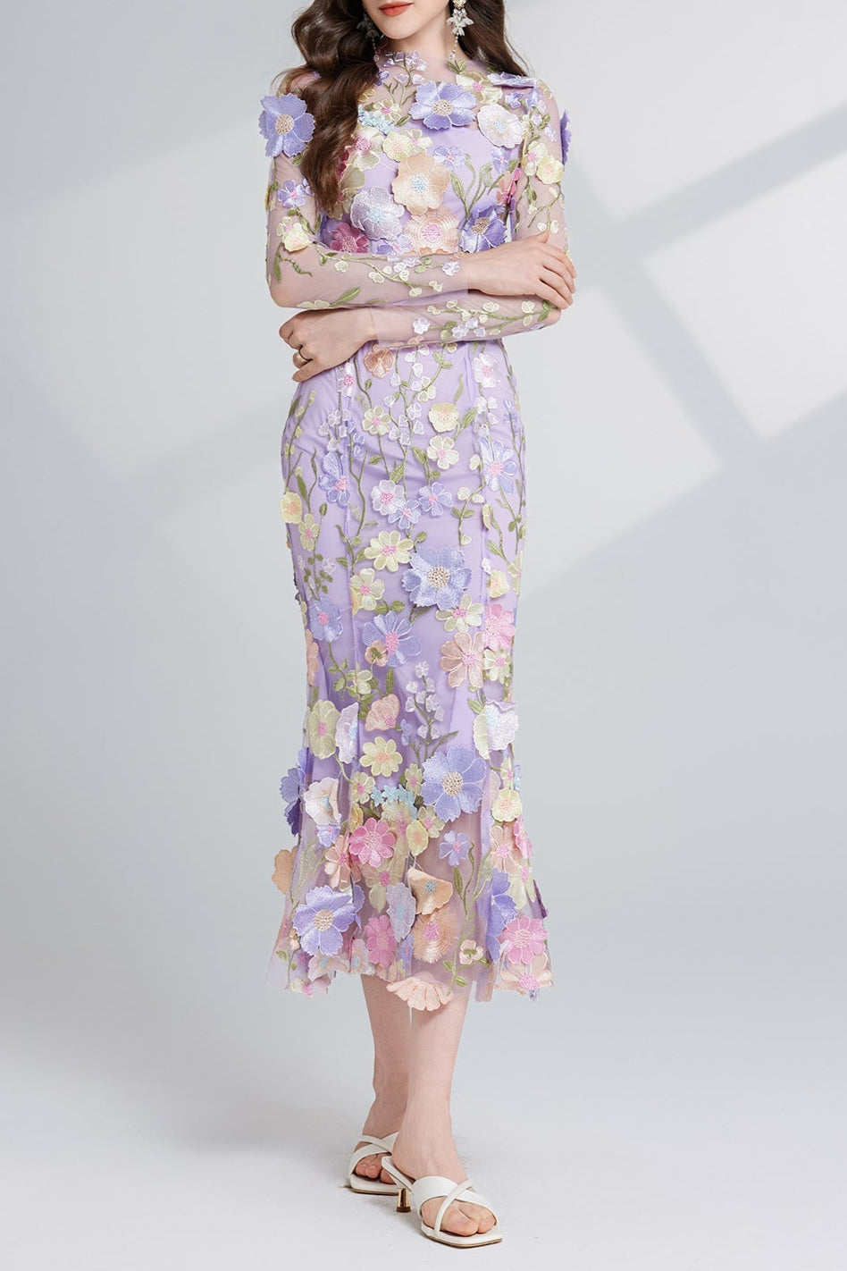 CAROL PURPLE FLORAL EMBROIDERY MESH LONG SLEEVE MIDI DRESS