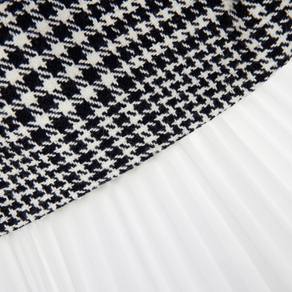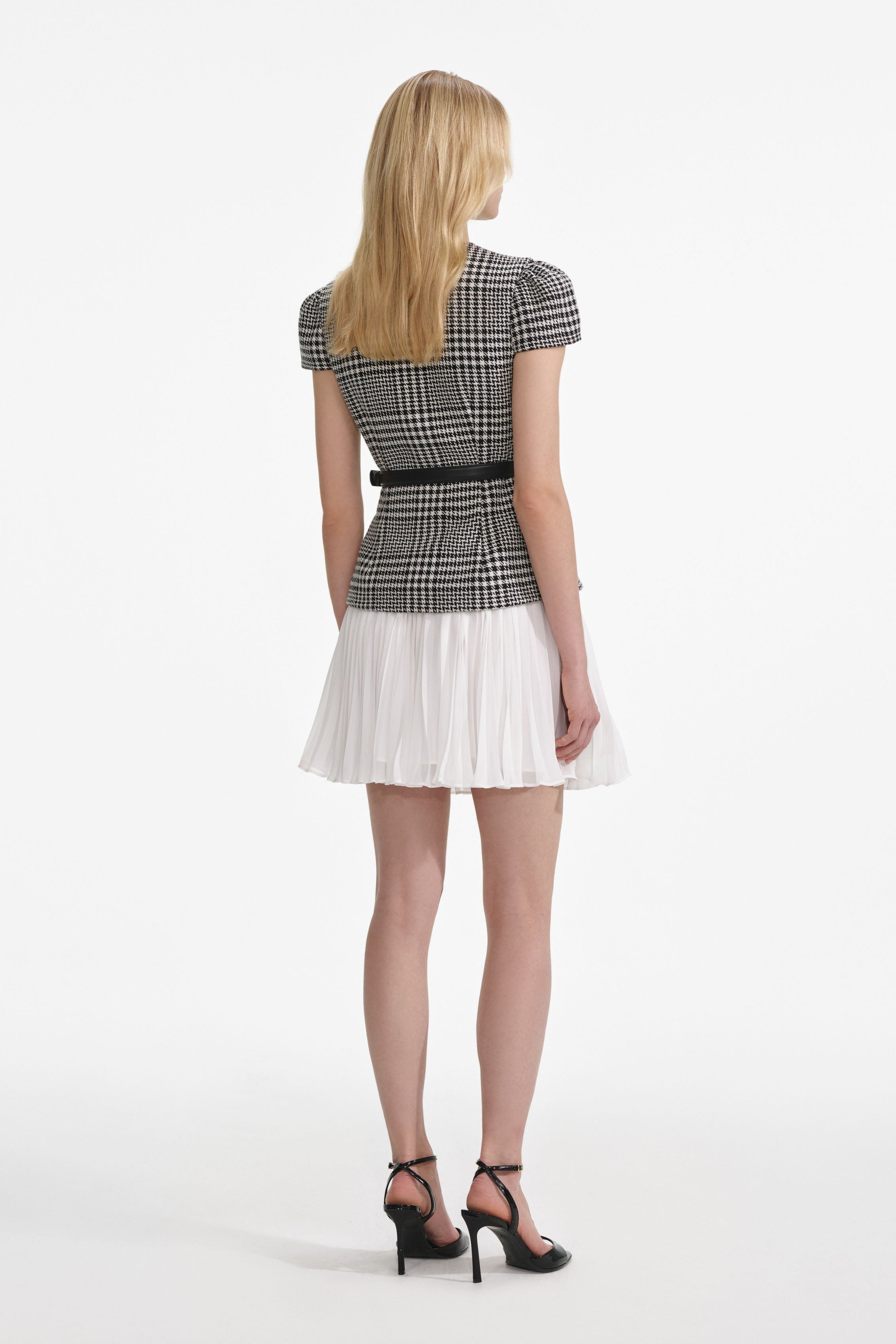 Classic tailoring meets timeless elegance in this mini dress, cut from houndstooth wool check. A belted waist cinches in the form above a pleated skirt – add heels to go from desk to dinner.