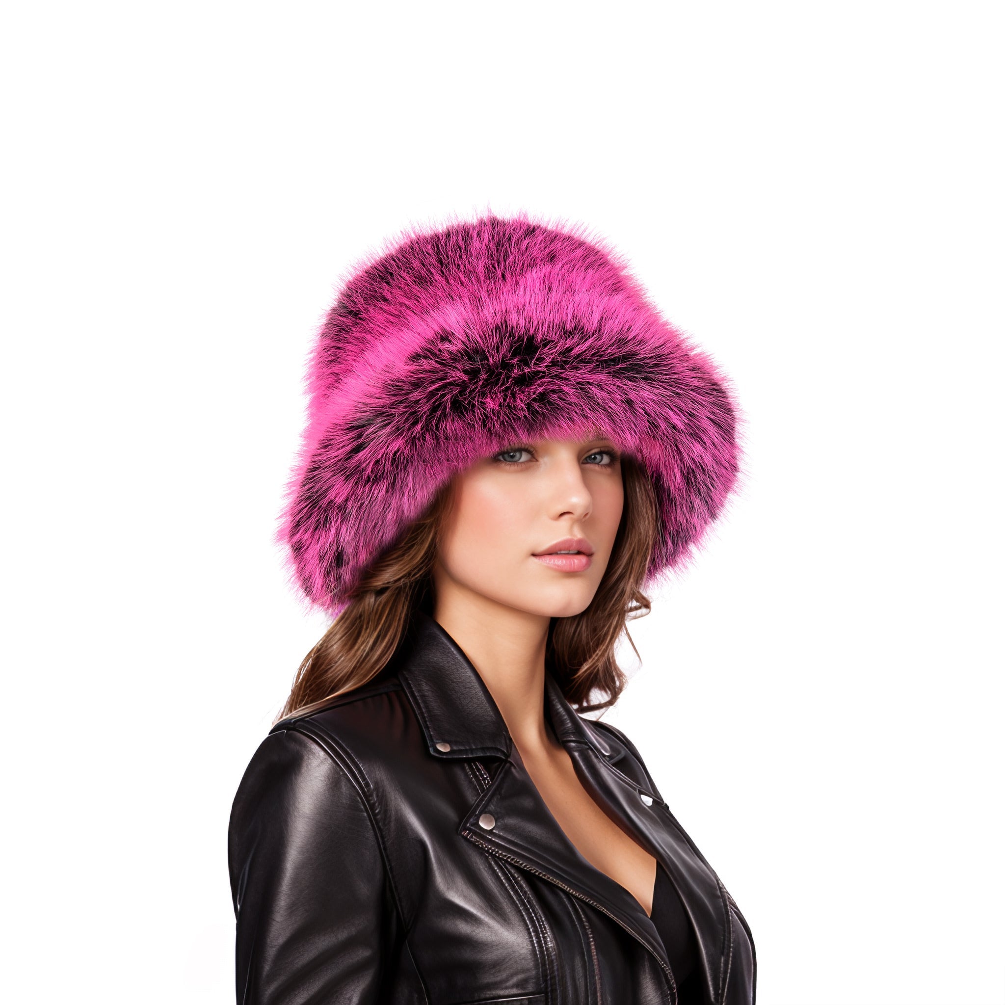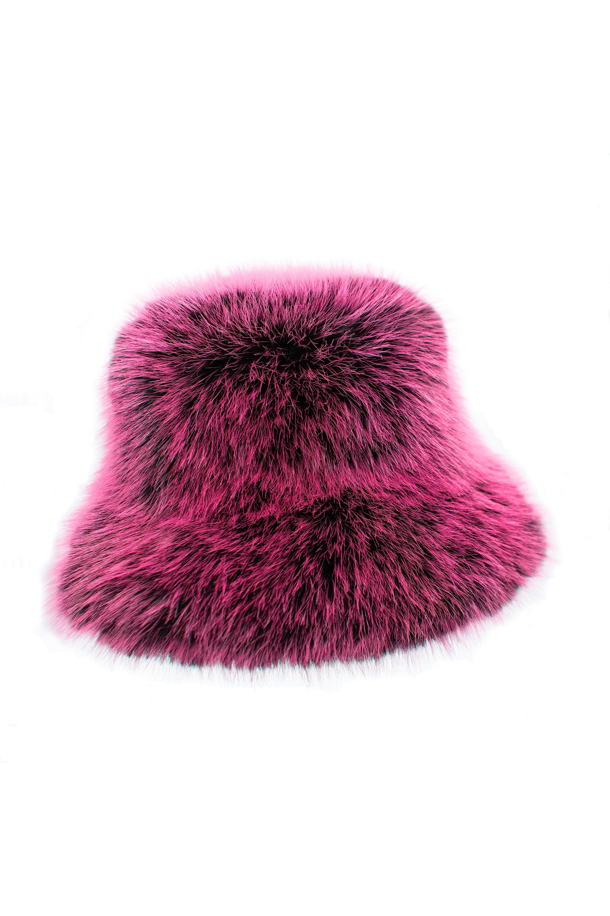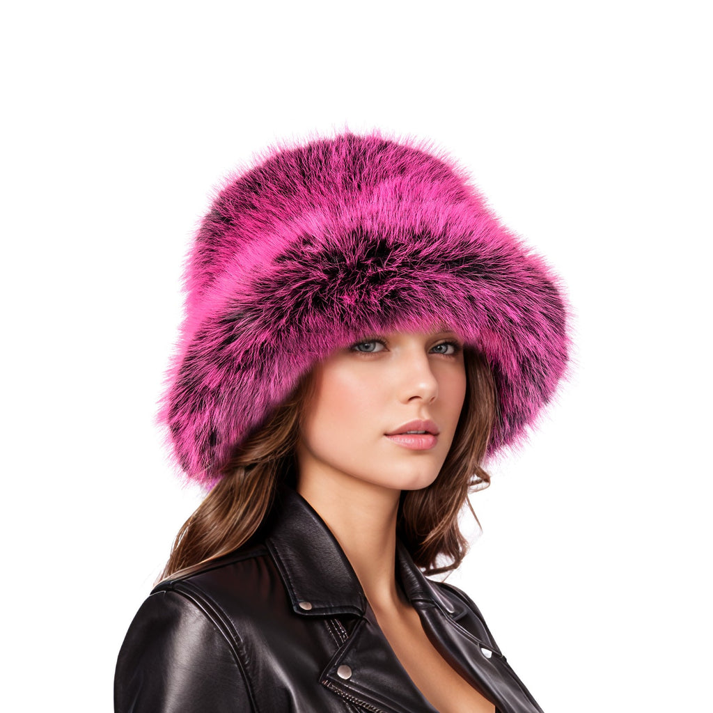 Faux fur bucket hat in black color with pink tips. Made of fluffy and soft vegan fur. The head circumference is 58cm, which fits most of people.