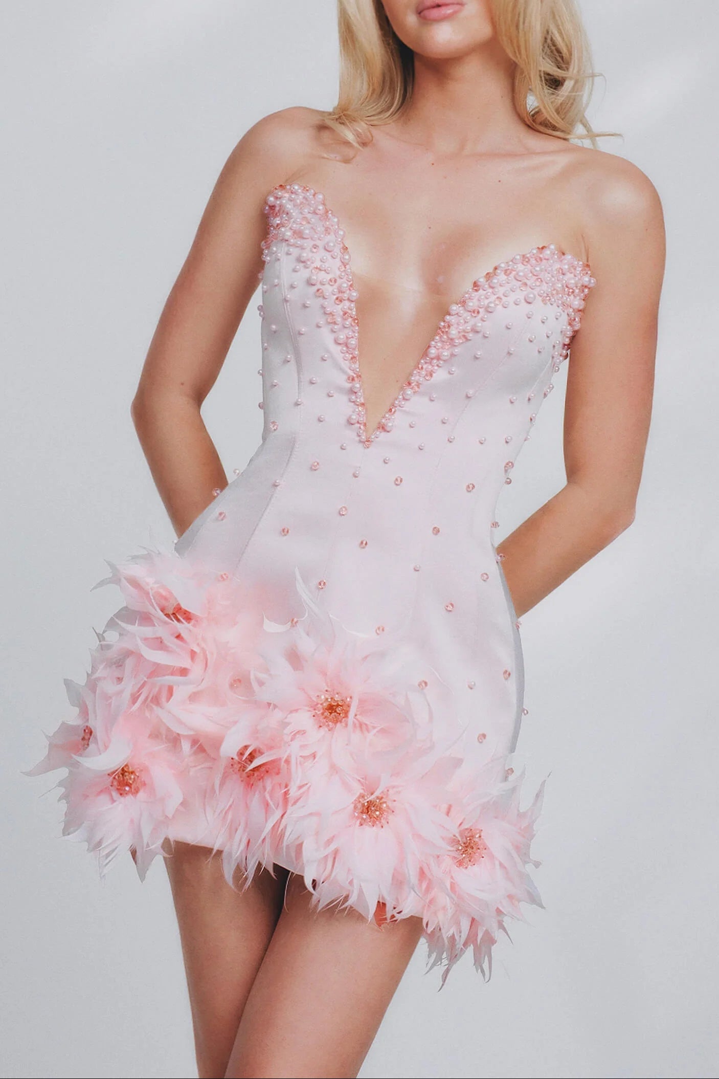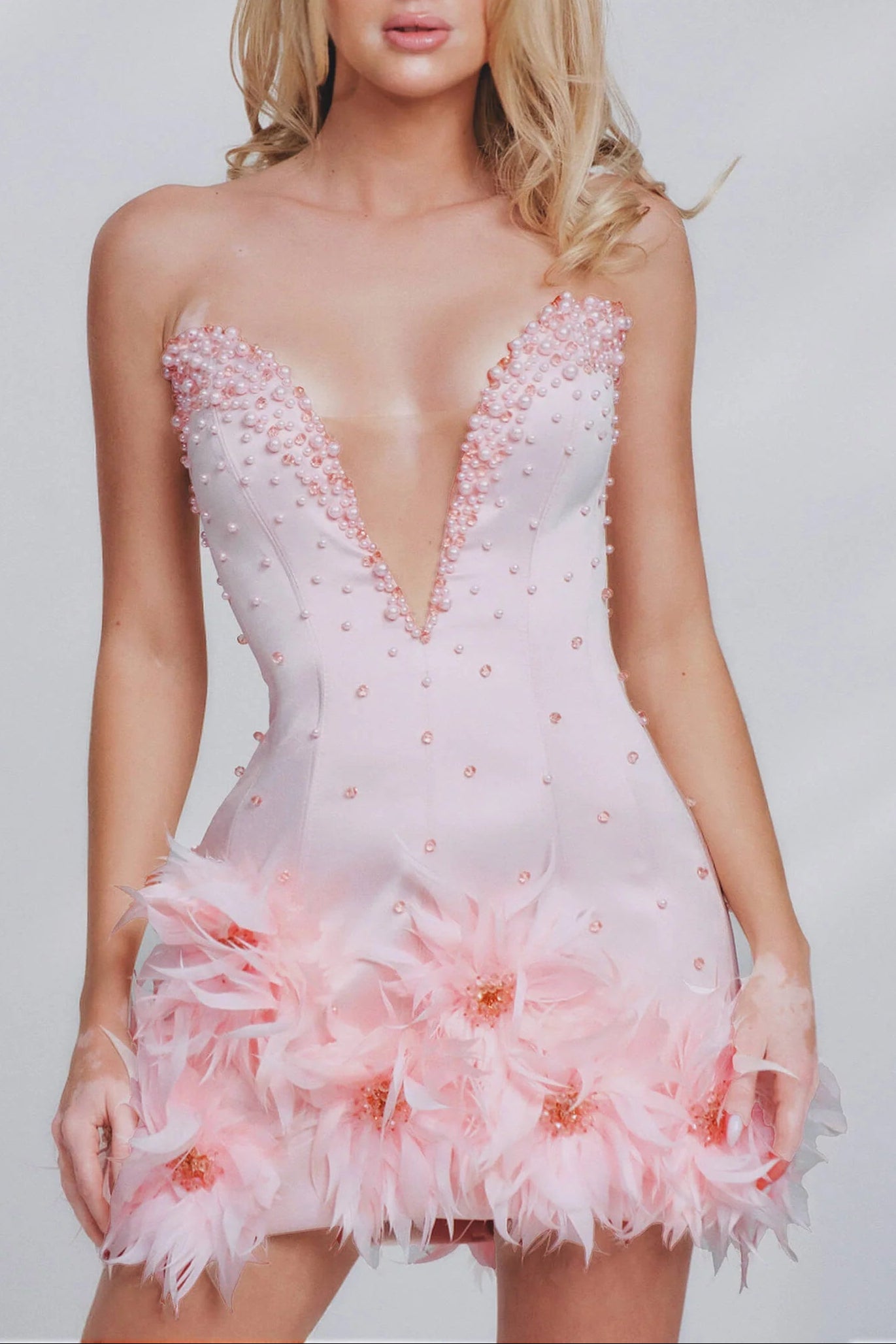 maria Tube Top deep V-neck pearl bodycon mini dress in pink – Ellalabel.com