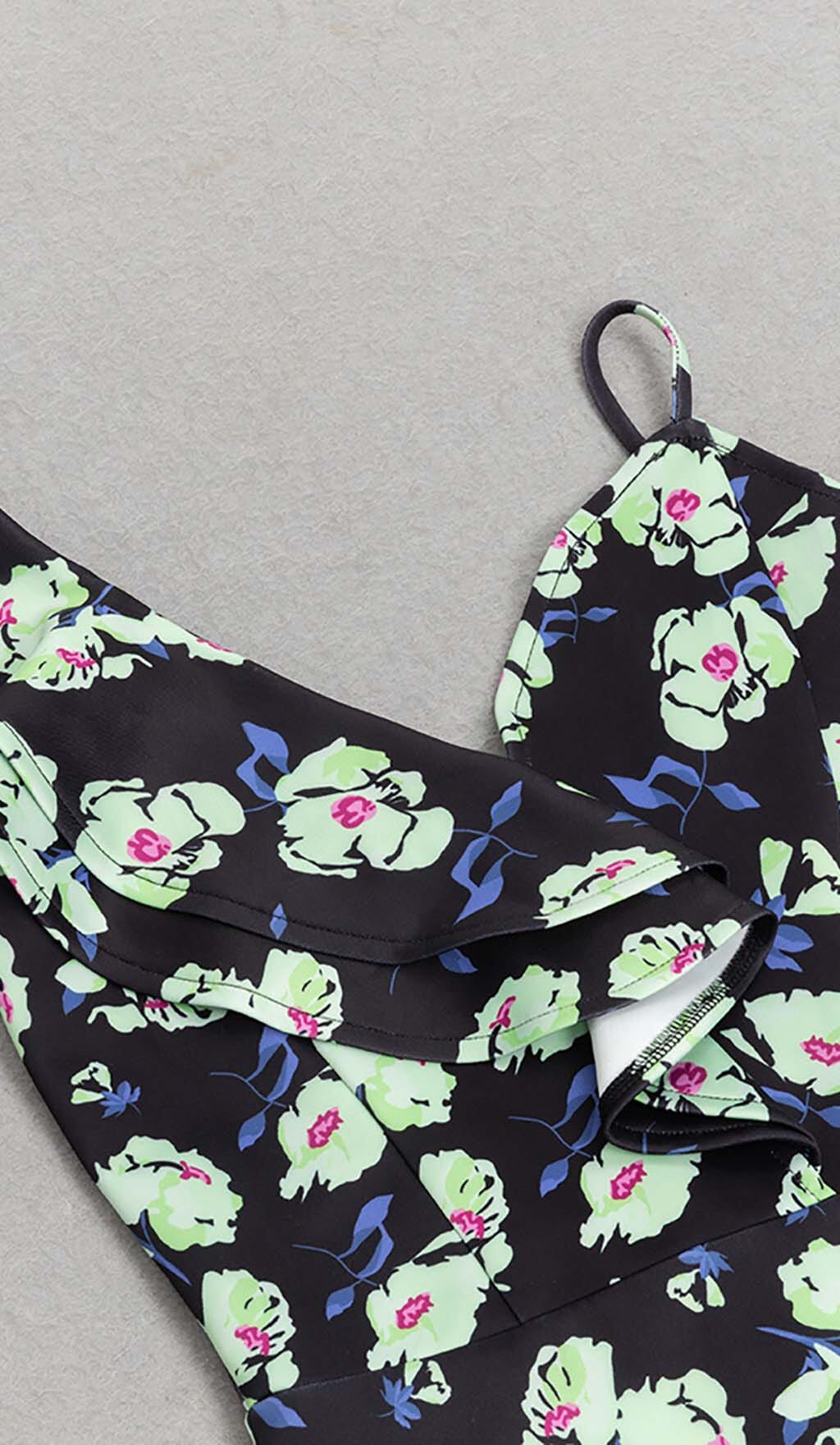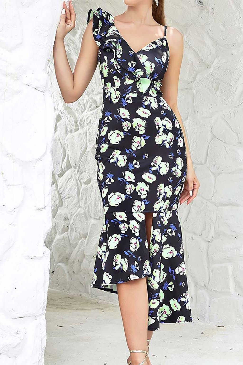 Romantic and feminine, this floral print midi charms with rows of ruffles down the skirt. The surplice V-neck flatters your bust while the ruffle trim adds playful bounce. Cut from lightweight, flowy fabric in a lively flower print. This pretty dress promises to be your go-to for garden parties and summer soirées!