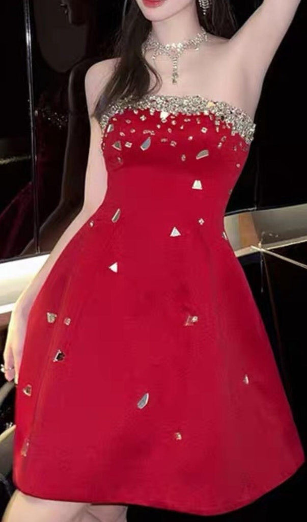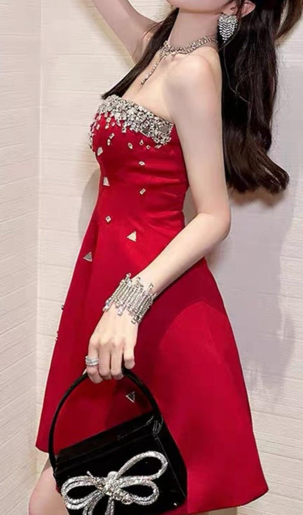 audrey RED CRYSTAL-EMBELLISHED STRAPLESS MINI DRESS