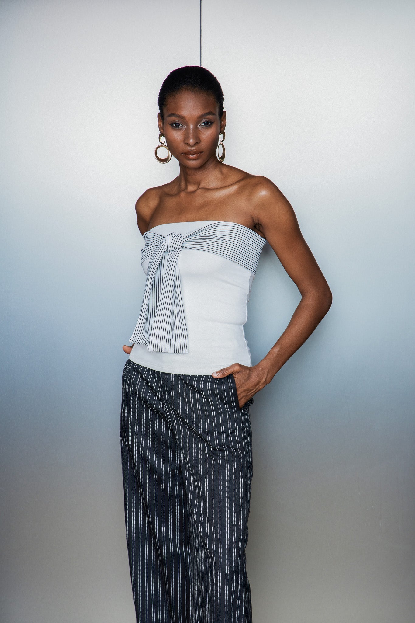 The Cassio Stripe Tie Up Strapless Top features a chic strapless design enhanced by a stylish tie-up detail, allowing for a customizable fit and added visual interest. Its striped pattern offers a timeless aesthetic, perfect for elevating both casual and dressier looks. Designed with expert craftsmanship, this top ensures comfort and versatility, making it a sophisticated choice for modern wardrobes.