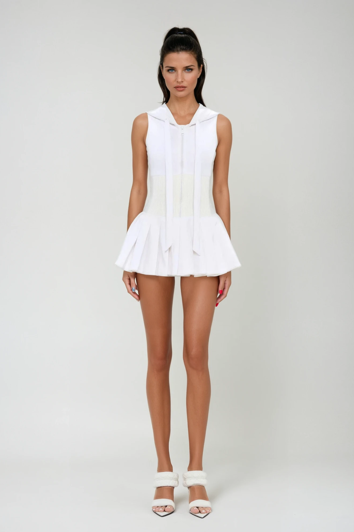 Damodar Sleeveless Hooded Ruch Mini Dress In White