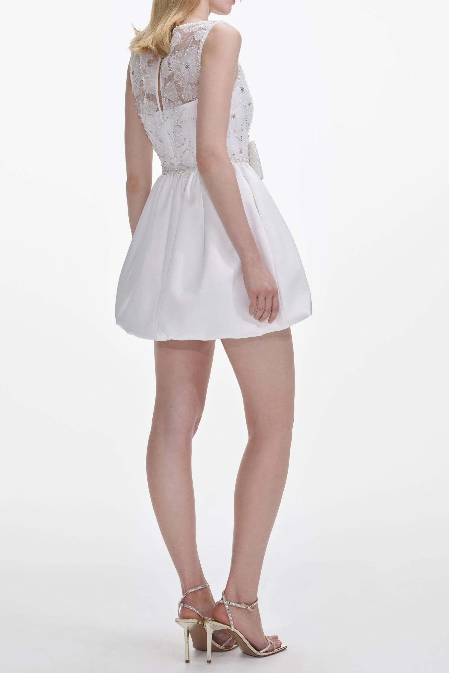 Playful proportions bring elegant charm to this white tulle and taffeta mini. Embellished with flower motifs, a boat neckline is cinched by an oversized bow above a full skirt for added drama.