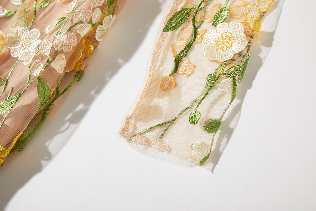 CAROL YELLOW FLORAL EMBROIDERY MESH LONG SLEEVE MIDI DRESS