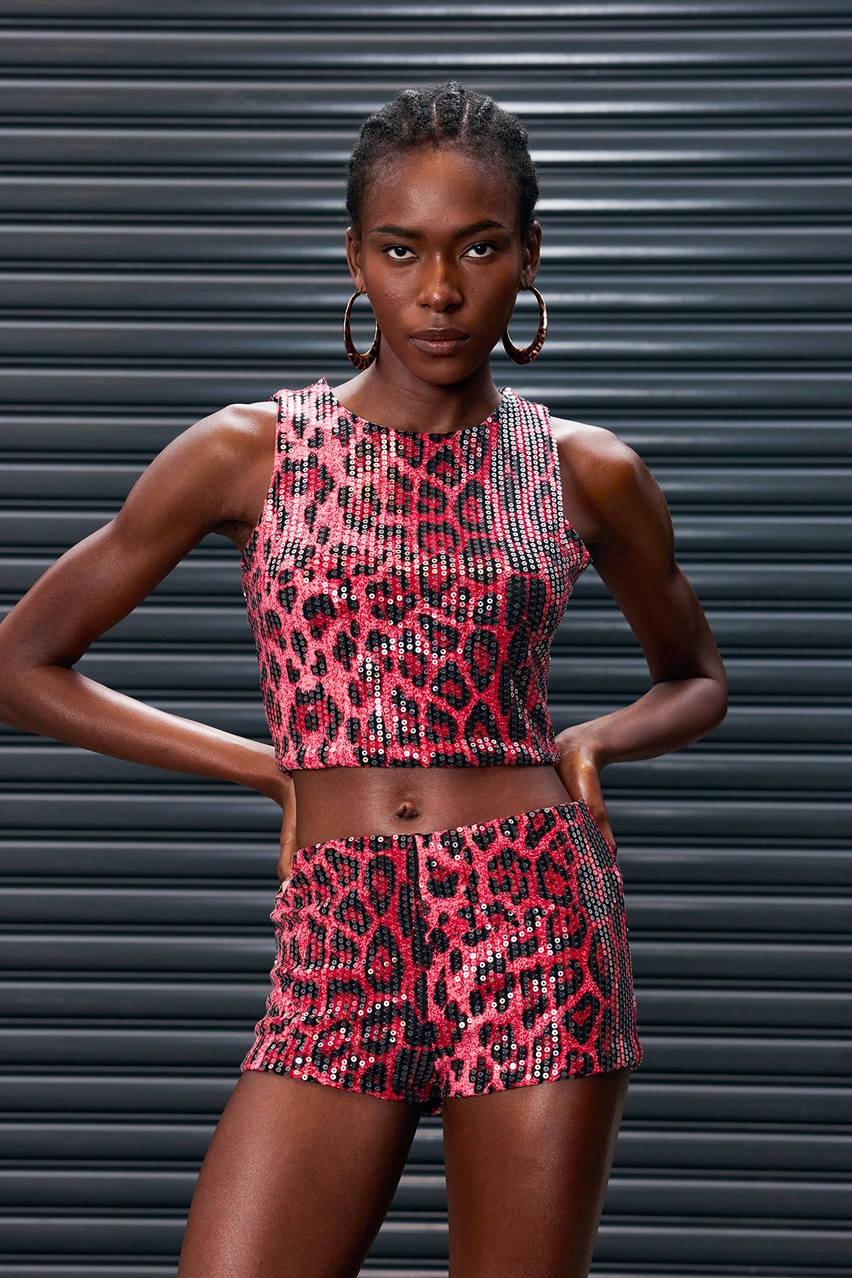 Expertly designed with a fierce leopard sequin pattern, the Anthea Pants Set effortlessly combines style and comfort. The figure-hugging bodycon silhouette accentuates your curves while the high-quality material ensures durability and a comfortable fit. Make a bold statement with this glamorous and versatile outfit.