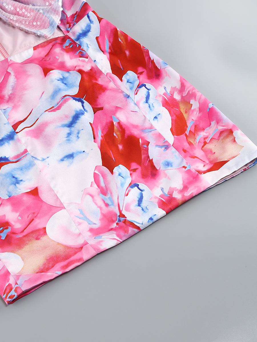 STRAPLESS LARGE BOW DECORATED PRINTED HIP MINI DRESS